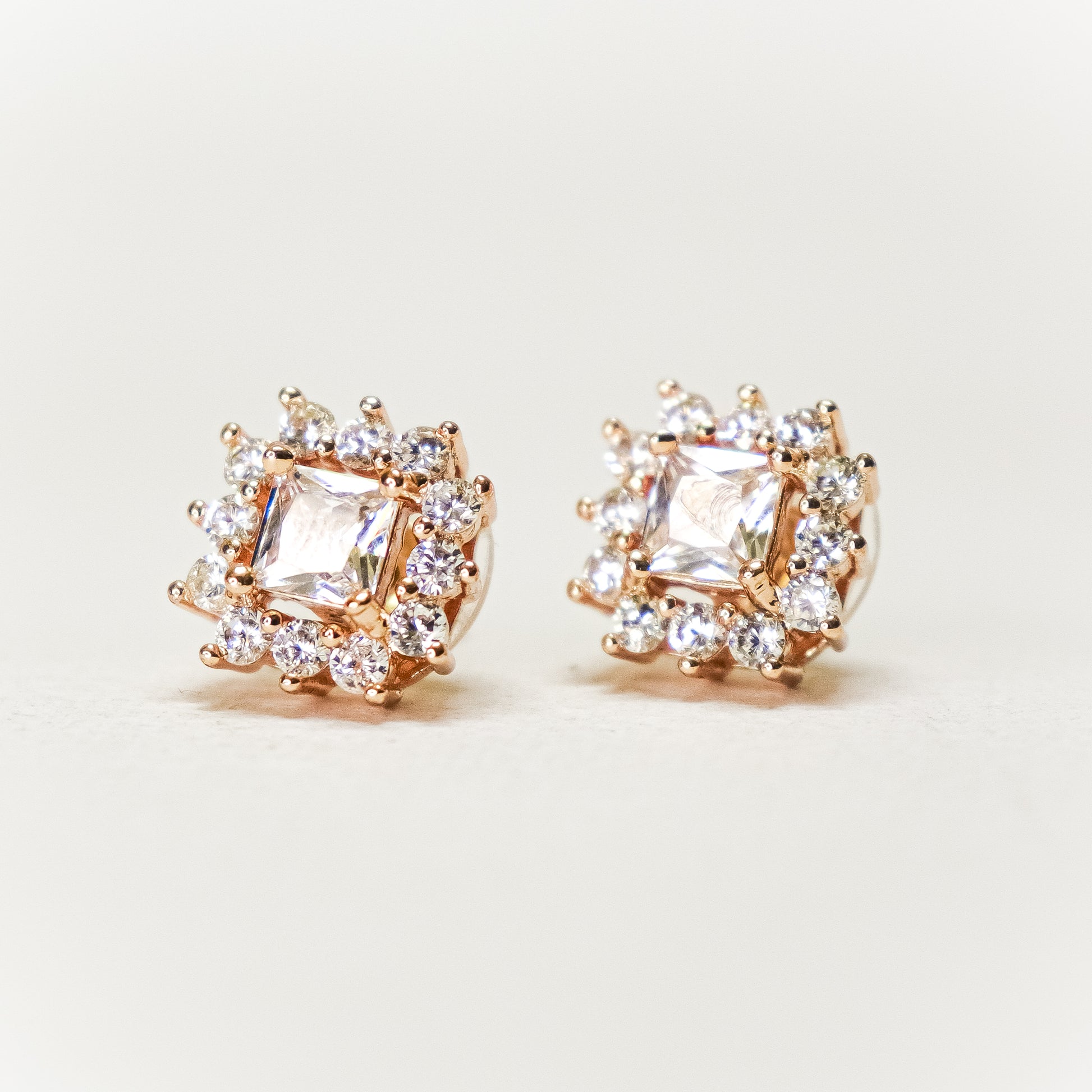 Elegant Rose Gold Zircon daily wear comfortable minimal stud zircon rhinestone earrings for woman. Easy to wear before you head out for office or a meeting. These Stud top earrings made out of a strong alloy metal studded with american diamond AD rose gold stones is sure to make a flash from far away and uplift your everyday look.