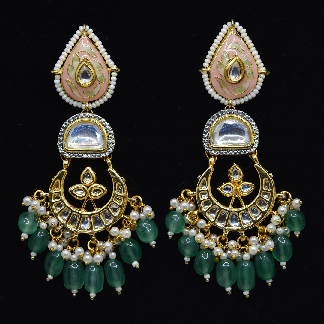 Exquisite Grand Gold Plated American Diamond Studded Mint Green Pink Uncut Polki Kundan Stones Jewellery Earrings for a Bridal/ Wedding and traditional wear lehengas / festive wear looks. Designed with Pearl dropping to suit every Indian ethnic and indo - western wear outfit. Best Part: These Crystal Earrings have a silver foiled meenakari finish from the back and have been handcrafted with alot of love.